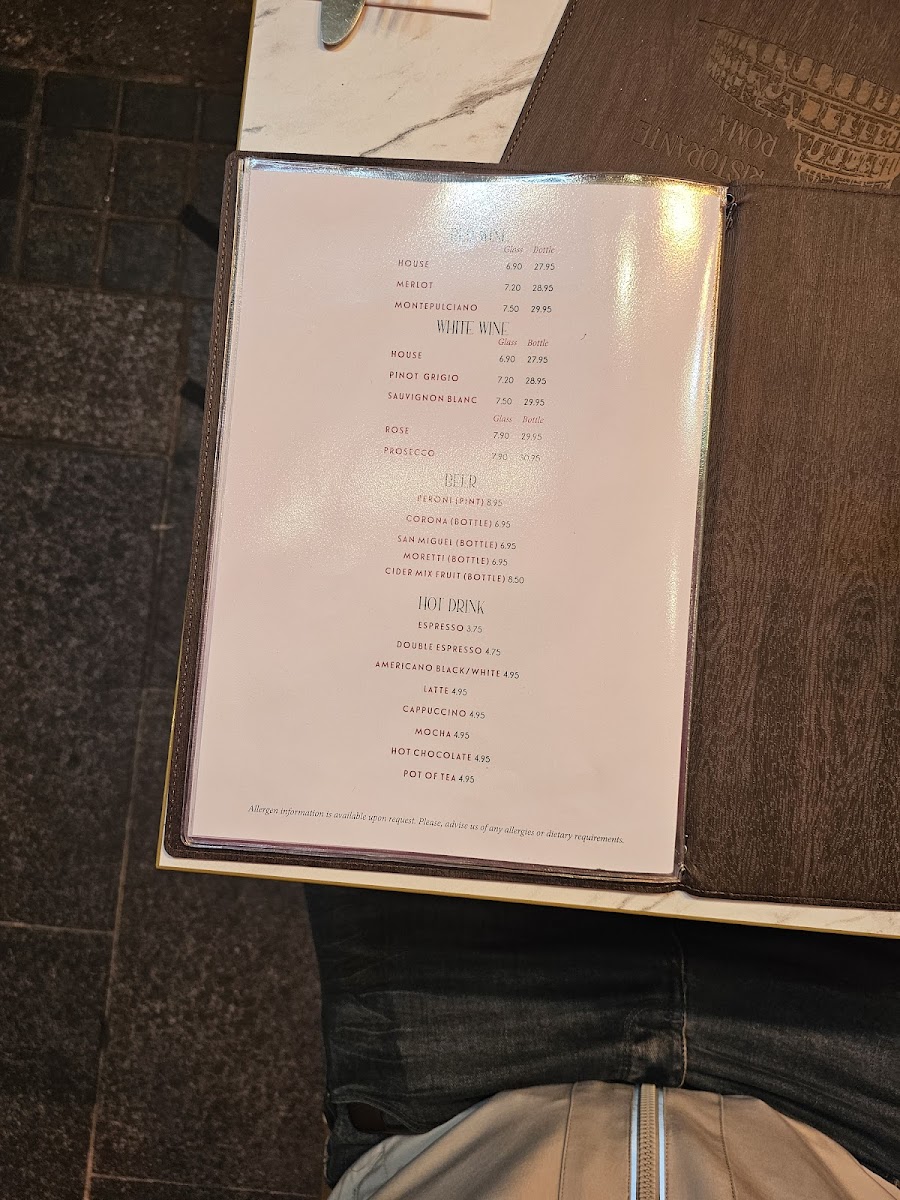 For lighter fare, the Chicken Salad (£17.95) is refreshing and vibrant. Pair your meal with a delightful sip, choosing from an impressive array of wines, including Merlot (£7.20) and Montepulciano (£7.50), or chill out with a cold Peroni (£8.95).